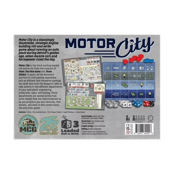 Motor City – Version Anglaise est un jeu d’engine-building et de roll & write, de 1 à 5 joueurs, dès 14 ans, pour des parties de 45 minutes environ, édité par 25th Century Games.