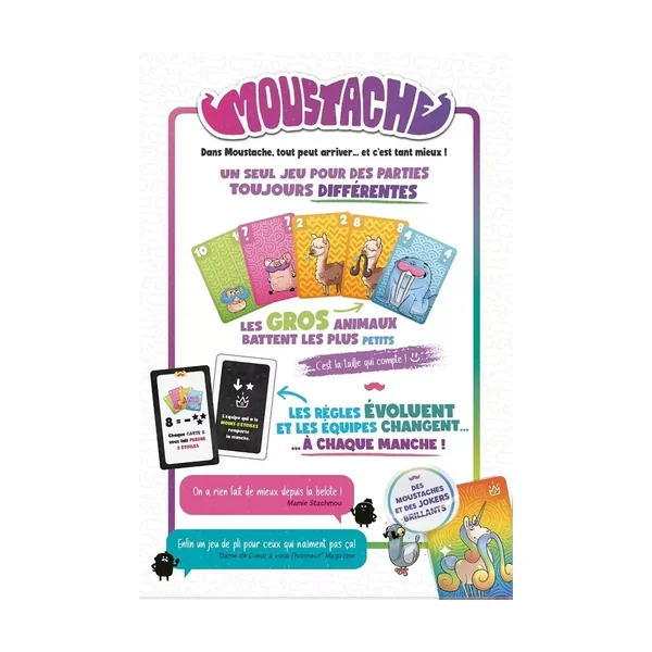 Porté par un système de règles évolutives, Moustache garantit des parties uniques, pleines de surprises et de rebondissements. Facile à prendre en main et irrésistiblement fun, c’est le compagnon idéal des soirées entre amis ou en famille.