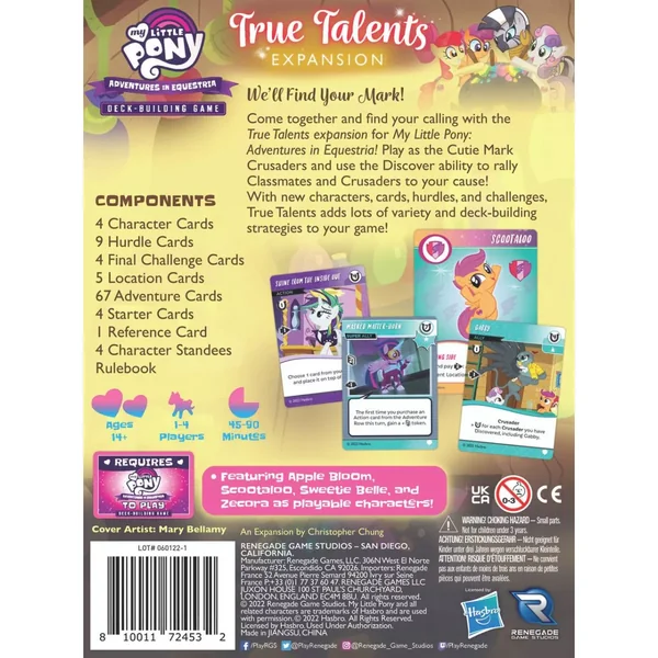 My Little Pony DBG : True Talents est une extension du jeu My Little Pony : Adventures in Equestria Deck-Building Game pour 1 à 4 joueurs dès 14 ans, des parties de 45 à 90 minutes, édité par Renegade Game Studios.