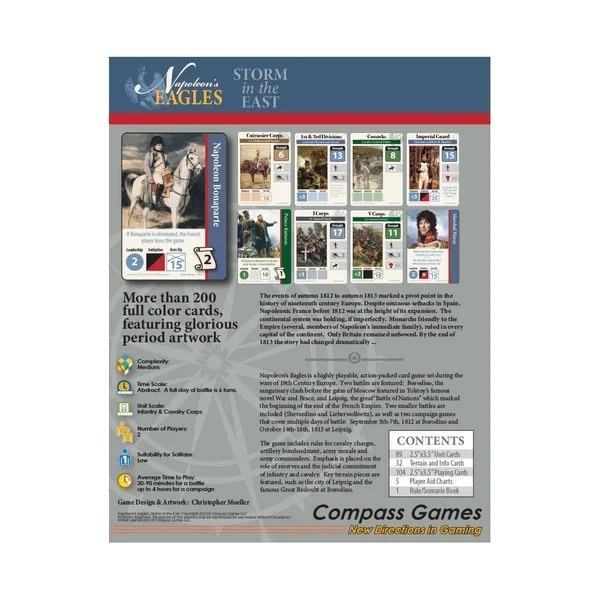 Deux batailles plus petites sont incluses (Shevardino et Lieberwolkwitz), ainsi que deux jeux de campagne qui couvrent plusieurs jours de bataille : Du 5 au 7 septembre 1812 à Borodino et du 14 au 18 octobre 1813 à Leipzig. Le jeu comprend des règles pour les charges de cavalerie, le bombardement d’artillerie, le moral de l’armée et les commandants de l’armée. L’accent est mis sur le rôle des réserves et l’engagement judiciaire de l’infanterie et de la cavalerie. Des pièces clés du terrain sont mises en avant, comme la ville de Leipzig et la célèbre Grande Redoute de Borodino.
