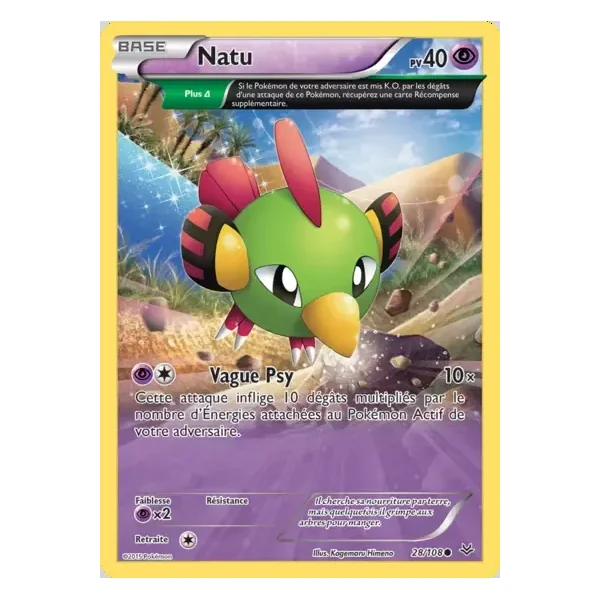 Découvrez Natu (ros028), une carte Pokémon de l’extension Ciel Rugissant, provenant du bloc XY. Idéale pour compléter votre collection, cette carte Commune plaira autant aux collectionneurs qu’aux joueurs.