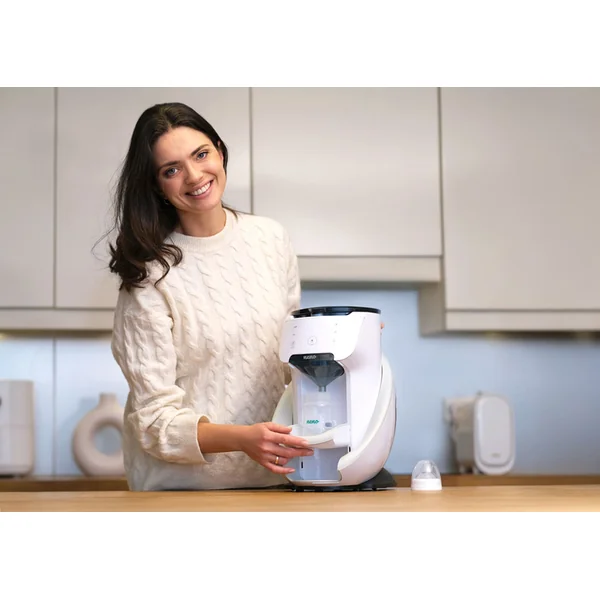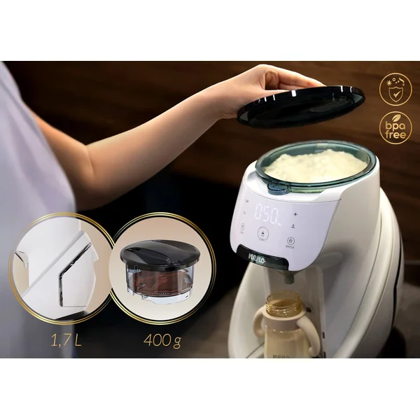 - Lait prêt en quelques secondes : L’appareil prépare un biberon de lait parfait en quelques secondes. Il suffit de verser du lait modifié et de l’eau froide bouillie. L’appareil garantit la bonne température sans confusion ni désordre inutiles.