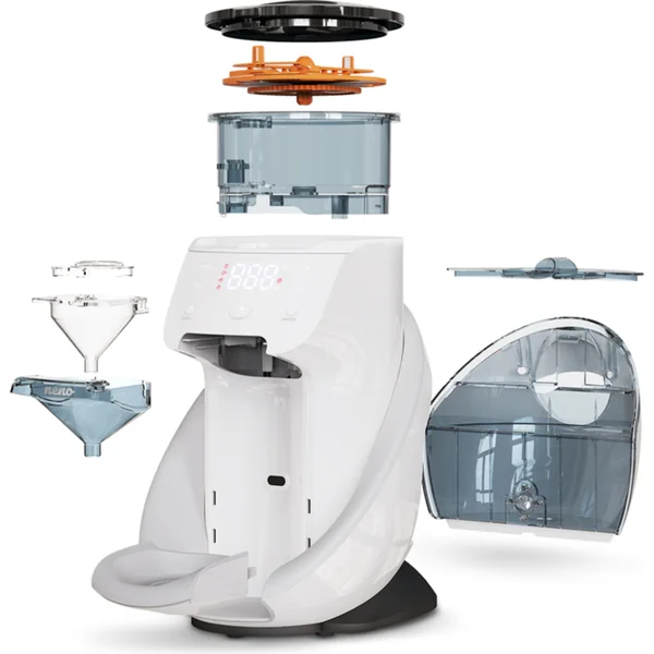 - Sans grumeaux ni bulles : Grâce à un réglage en 3 étapes de la hauteur du biberon, vous pouvez placer le biberon juste à côté de l’entonnoir, ce qui réduit la formation de bulles d’air. Ce système garantit une consistance parfaitement lisse par rapport à une préparation manuelle.