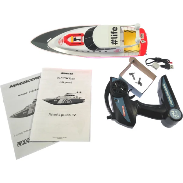 L’emballage contient le bateau télécommandé NINCOCEAN Lifeguard, l’émetteur 2,4 GHz, l’accumulateur lithium intégré de 3,7 V, un câble USB pour la charge, 2x hélices de rechange, un support en papier. Manuel en SK et mode d’emploi en EN, ES, PT, DE, FR, IT, DK, NO, FI, SV, NO.