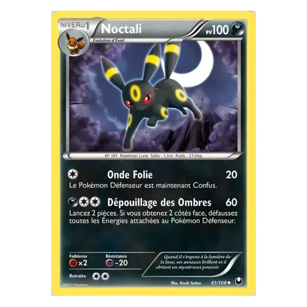 Découvrez Noctali (dex061), une carte Pokémon de l’extension Explorateurs Obscurs, provenant du bloc Noir & Blanc. Idéale pour compléter votre collection, cette carte Peu Commune plaira autant aux collectionneurs qu’aux joueurs.