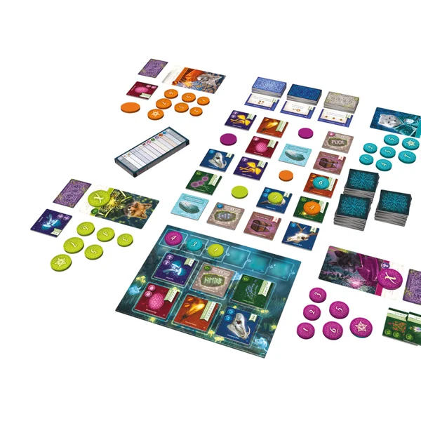 À chaque tour, vous commencez avec un ensemble de jetons numérotés qui représentent vos forces en matière de sorts. Ces jetons sont utilisés pour lancer des sorts et enchérir sur une grille d’objets (et d’actions spéciales) sur le sol de la forêt. Une fois que vous avez lancé un sort, vos mystiques rivaux ont la possibilité de lancer un sort plus puissant sur un objet adjacent, dans l’espoir de l’attirer vers eux et de vous empêcher de collecter ce dont vous avez besoin !