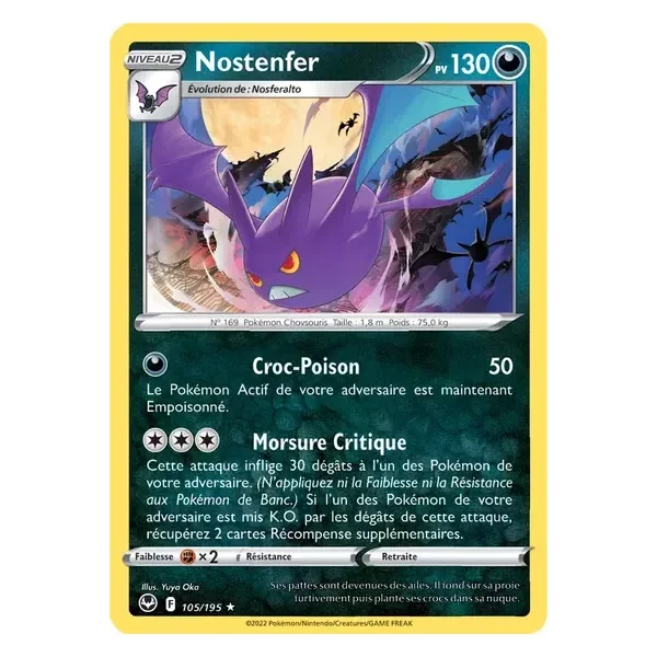 Découvrez Nostenfer (sit105), une carte Pokémon de l’extension Tempête Argentée, provenant du bloc Épée & Bouclier. Idéale pour compléter votre collection, cette carte Holo Rare plaira autant aux collectionneurs qu’aux joueurs.