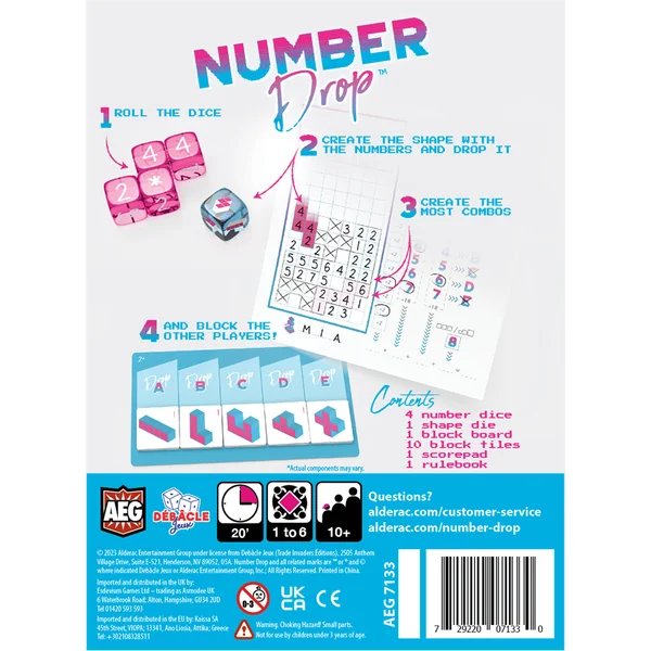 Découvrez Number Drop, le jeu de roll-and-write palpitant d’Alderac Entertainment Group ! Lancez les dés pour créer des formes uniques composées de chiffres et faites-les tomber stratégiquement dans votre grille. Ce jeu au style Tetris apporte une touche innovante au genre classique, mêlant habilement nombres et formes pour une expérience aussi dynamique que captivante.