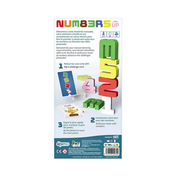 Dans Numbers Up, testez votre dextérité manuelle, votre attention visuelle et vos compétences en calcul mental pour être le premier à construire votre tour de nombres. Numbers Up est édité par MJ Games. Partie de 2 à 4 joueurs dès 7 ans, pour des parties d’environ 20 minutes.