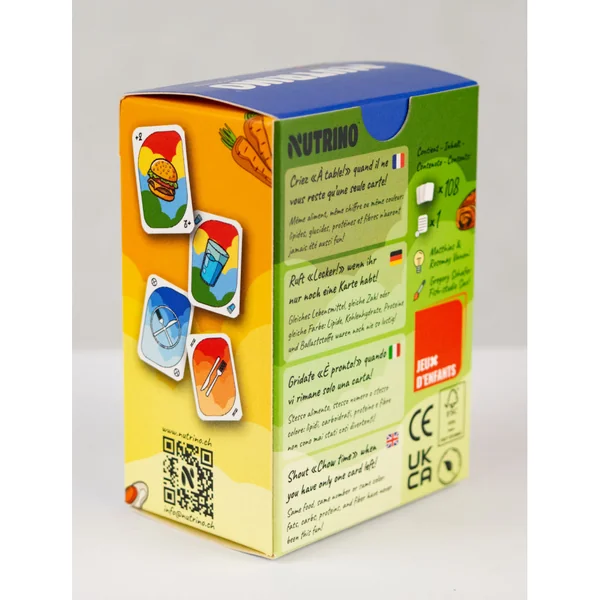 Le nouveau jeu de cartes dans lequel s’affrontent glucides, lipides protéines et fibres dans une bataille sans merci. Jouez le même chiffre, la même couleur ou le même aliment… mais attention aux cartes pièges. Tous les coups sont permis pour être le premier à poser sa dernière carte. +2, interdiction de jouer, ou changement de sens: jouez, apprenez et gagnez avec NUTRINO.
