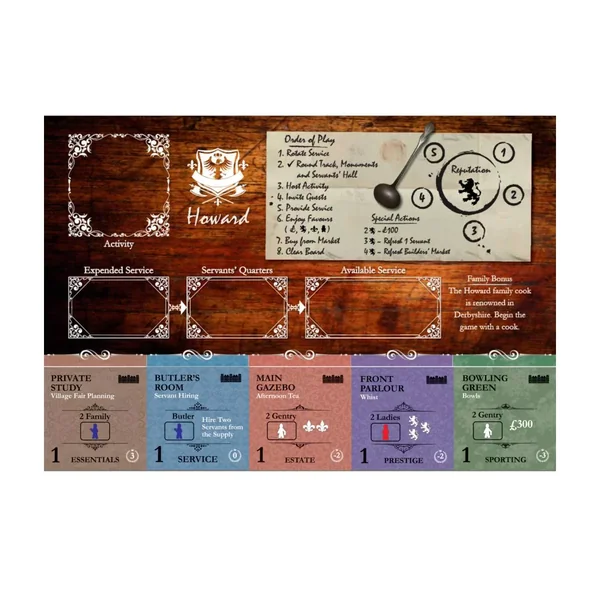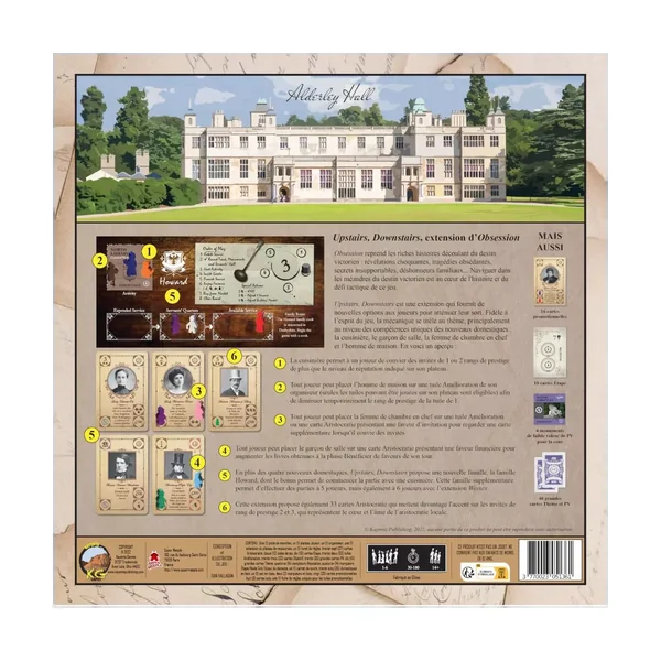 Obsession : Upstairs, Downstairs : L’extension ajoute le plateau de la famille Howard au mélange qui donne l’avantage d’avoir le cuisinier le plus talentueux du personnel. L’extension ajoute également 49 invités supplémentaires, cinq nouvelles tuiles d’amélioration, des jalons, des cartes de cour plus grandes, et trois nouveaux modes de jeu (Solo Estate Challenge, Tableau Obsession, et Cooperative Obsession).