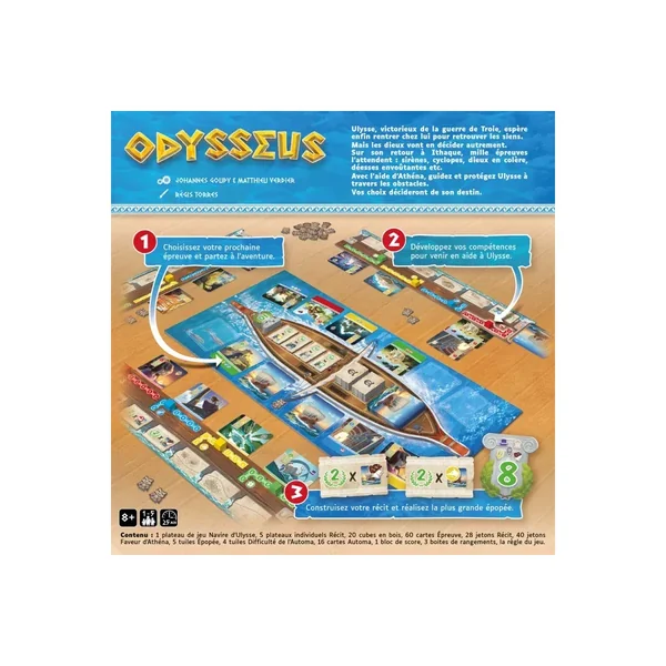 Odysseus est un jeu de société de stratégie familial jouable de 1 à 5 joueurs, dès 8 ans pour des parties de 25 minutes, édité par Gigamic.