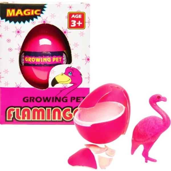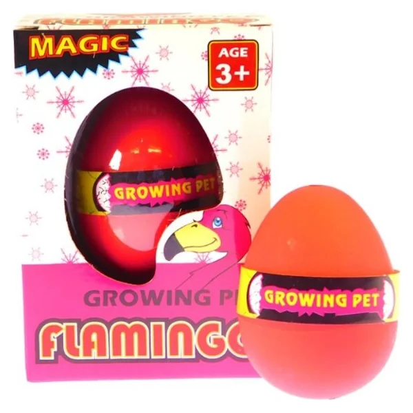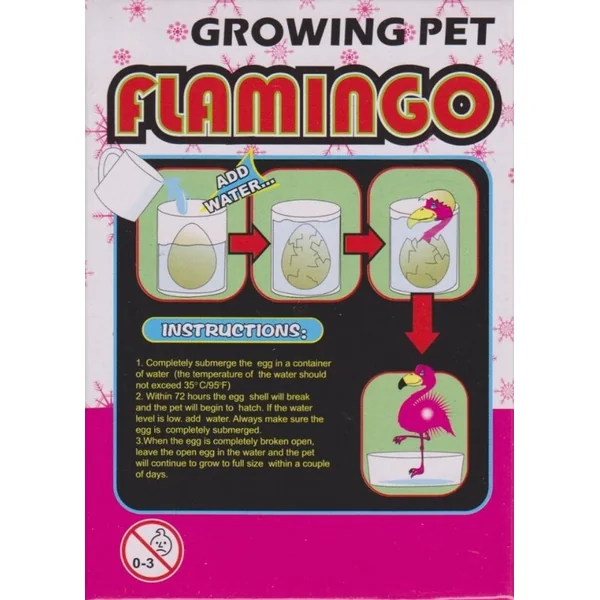 Un jouet amusant non seulement pour les enfants. Après immersion dans l’eau (la température ne doit pas dépasser 35°C) pendant 12 à 24 heures, une figurine de flamant rose éclot et atteint sa taille complète en environ 48 heures. Si de l’eau s’évapore pendant ce processus, il est nécessaire d’en rajouter.