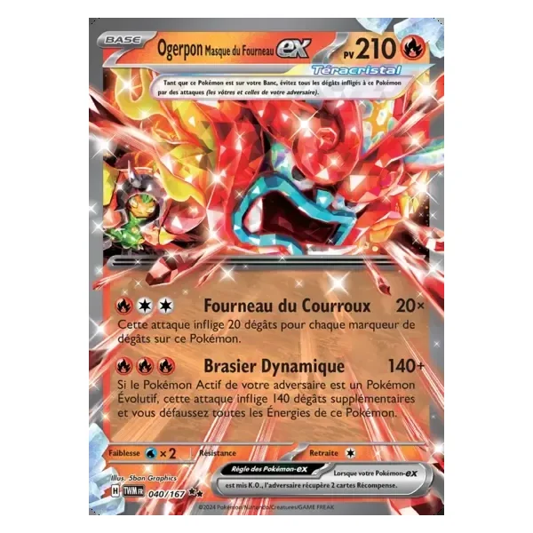 Découvrez Ogerpon Masque du Fourneau (twm040), une carte Pokémon de l’extension Mascarade Crépusculaire, provenant du bloc Écarlate & Violet. Idéale pour compléter votre collection, cette carte Double Rare plaira autant aux collectionneurs qu’aux joueurs.