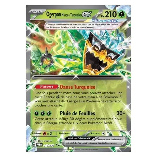 Découvrez Ogerpon Masque Turquoise (pre012), une carte Pokémon de l’extension Évolutions Prismatiques, provenant du bloc Écarlate & Violet. Idéale pour compléter votre collection, cette carte Double Rare plaira autant aux collectionneurs qu’aux joueurs.