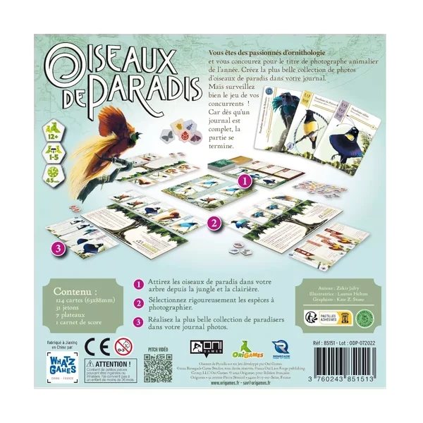 Oiseaux de Paradis : Chaque joueur, durant son tour, attire des oiseaux vers son arbre depuis la clairière et la jungle, prend des photos d’oiseaux dans son arbre ou court dans la jungle pour déplacer de nouveaux oiseaux vers la clairière. Il peut également utiliser ses actions pour se servir d’un zoom et photographier un oiseau dans l’arbre d’un autre joueur ou encore pour publier un article. Les cartes Oiseau et Publication s’ajoutent de gauche à droite dans le Journal photo de chaque joueur. Ce Journal constitue l’ensemble des points de victoire en fin de partie.