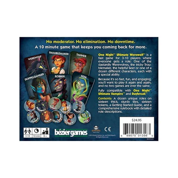 One Night ultimate Werewolf est un jeu rapide où tout le monde a un rôle différent. Au cours d’une seule nuit et du lendemain matin, les joueurs vont déterminer qui parmi eux est un loup-garou …Peut-être. One Night Ultimate Werewolf est un micro-jeu d’ambiance qui ne nécessite pas de maitre de jeu. Il n’y a pas d’élimination, et chaque partie dure environ 10 minutes.