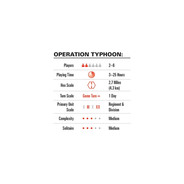 Operation Typhoon est un wargame à l’échelle opérationnelle de cet affrontement titanesque. Les joueurs ne se préoccupent pas des détails du combat tactique, ni des grandes décisions stratégiques des Hauts Commandements. Leur tâche consiste à gérer une offensive au niveau du corps d’armée et de l’armée : répartir les précieuses formations blindées, choisir des lignes défensives solides, allouer les ravitaillements, et affecter les unités aériennes au soutien au sol ou à des missions d’interdiction. Le vainqueur sera celui qui fera preuve de la plus grande ingéniosité et du meilleur sens opérationnel.