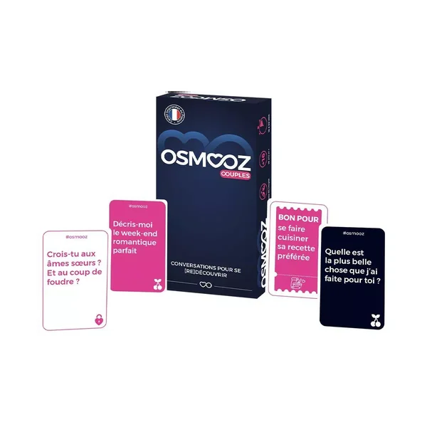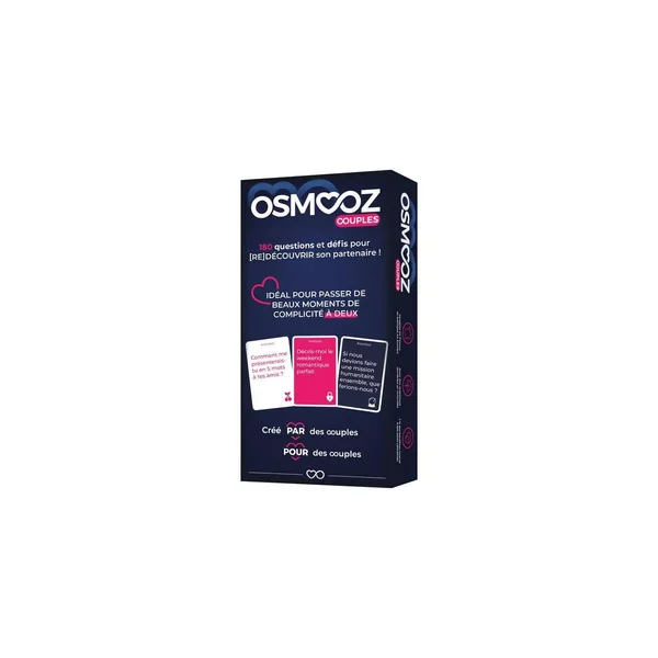 Un jeu entre amoureux ou en date, de 15 à 45 minutes. 180 conversations répartie en 5 catégories de discussions : Révélations sur soi, Complicité, Nos Projets, Olé Olé et Défis. Osmooz, le jeu idéal pour un date, un cadeau ou juste passer de beaux moments de complicité à deux. De l’amour en cartes !
