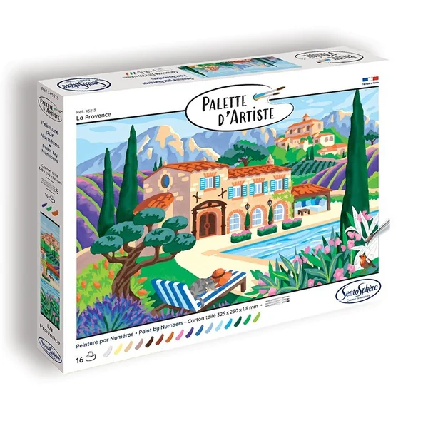 Laissez-vous porter par l’éclat des couleurs avec la peinture par numéros Palette d’Artiste – Provence. Faites apparaître, couleur après couleur, une belle maison entourée de verdure et de montagne, une piscine aux eaux éclatantes et des transats parfaits pour se détendre sous le soleil.
