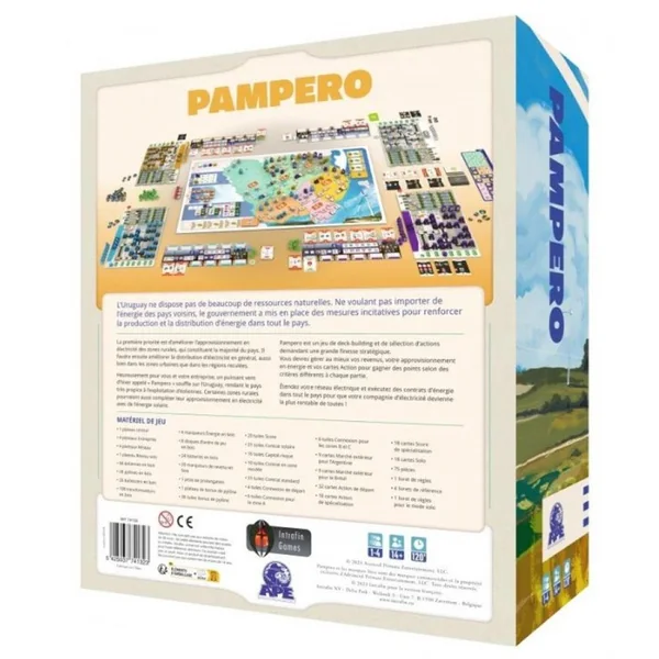 L’Uruguay ne dispose pas de beaucoup de ressources naturelles. Ne voulant pas importer l’énergie des pays voisins, le gouvernement a mis en place des mesures incitatives pour renforcer la production et la distribution d’énergie dans tout le pays. Heureusement, Pampero, un puissant vent d’hiver souffle sur l’Urugay, rendant le pays très propice à l’exploitation d’éoliennes. Pampero est un jeu de deck-building et de sélection d’actions demandant une grande finesse stratégique. Vous devez au mieux gérer vos revenus, votre approvisionnement en éngergie et vos cartes Action pouir gagner des points selon des critères différents à chaque partie. Etendez votre réseau électrique et exécutez des contrats d’éngergie dans tout lepays pour que votre compagnie d’électricité devienne la plus rentable de toutes !