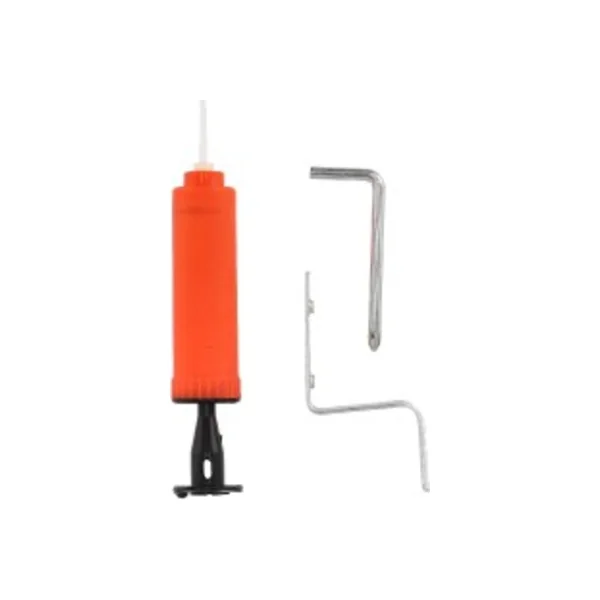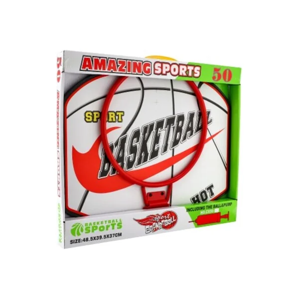 Panier de basket avec un panneau en bois à suspendre, un ballon et une pompe pour gonfler le ballon.