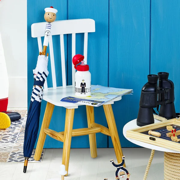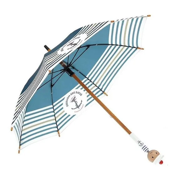 Vos enfants seront bien protégés avec le parapluie « Ecole des mousses » ! Un accessoire pratique et plein de charme avec son beau bleu marine, ses finitions en bois laqué et son pommeau en forme de tête de marin.