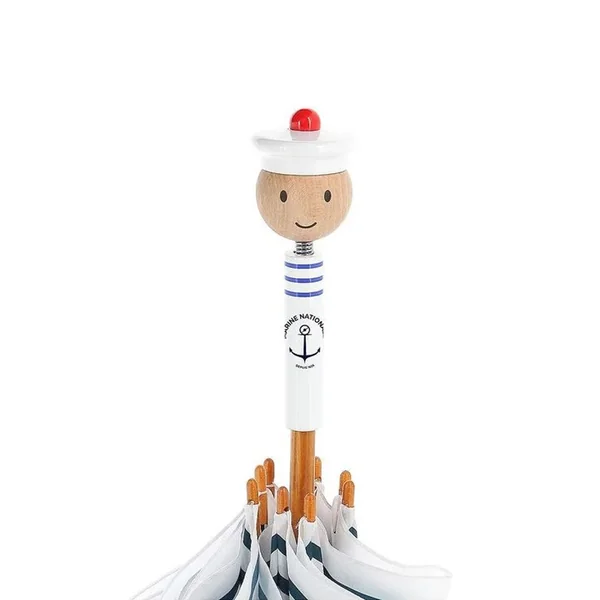 Imaginé par Vilac et la Marine nationale, le parapluie « Ecole des mousses » a tout pour plaire avec ses couleurs inspirées par l’uniforme des équipages et son pommeau, fixé sur ressort, en forme de tête de marin.