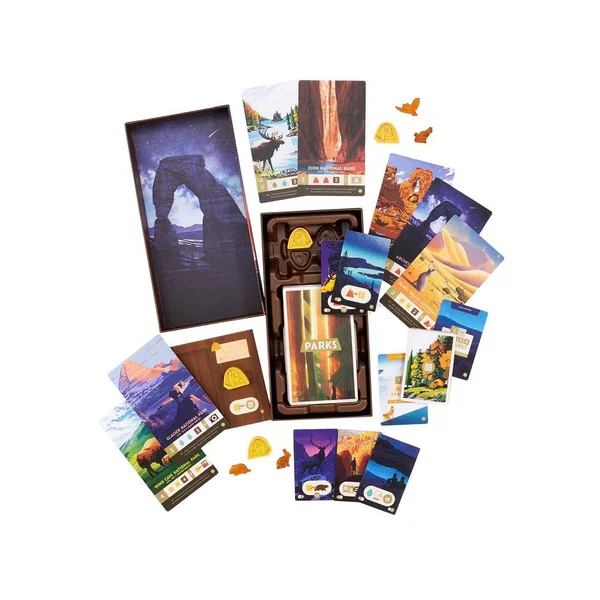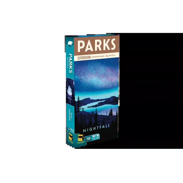 Nightfall est la première extension pour Parks. Vous y trouverez de nouvelles cartes parcs contenant des actions inédites, des cartes Année avec plus de missions à accomplir et des façons originales d’explorer le parcours grâce aux campings. Vous rencontrerez sûrement d’autres Animaux Sauvages, c’est pourquoi nous avons inclus de nouveaux jetons. Enfin, les nouvelles cartes parcs vous permettront de découvrir des Parcs Nationaux qui n’étaient pas présents dans le jeu de base.