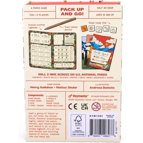 Parks: Roll & Hike met en vedette six parcs nationaux américains, illustrés par Andreea Dumuta, qui modifient les règles et offrent une expérience unique à chaque partie. Redécouvrez l’univers de Parks dans un format portable, idéal pour emporter partout, prêt à être glissé dans votre sac et à vous accompagner sur les sentiers.