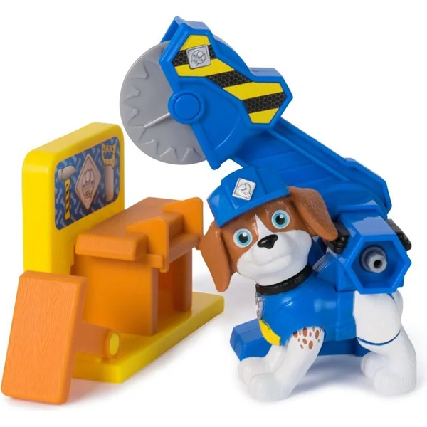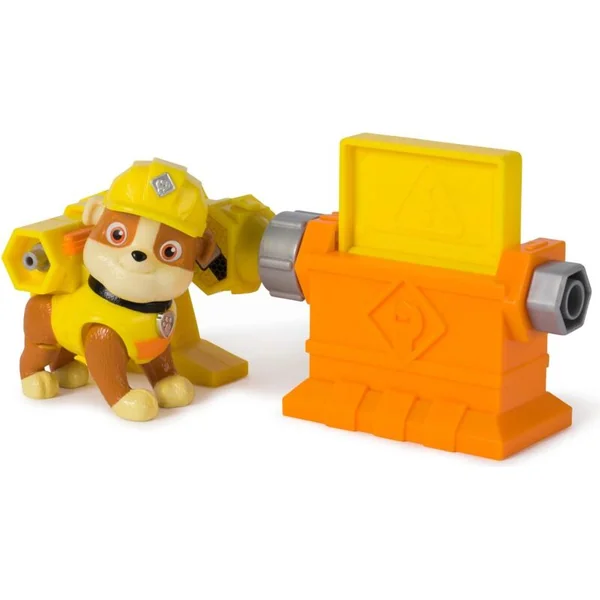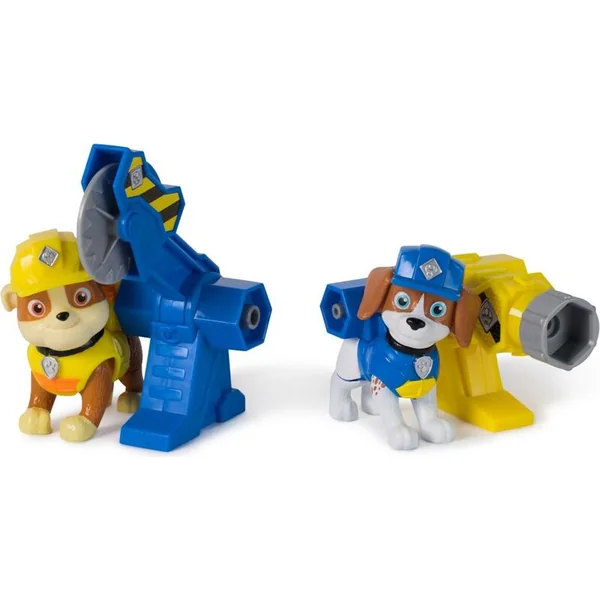 Les figurines des chiens sauveteurs Rubble et Wheeler arrivent à l’aide avec des outils. Fixe la figurine à l’outil, appuie dessus et regarde comment l’outil se met en mouvement. Tu peux échanger les figurines entre elles.