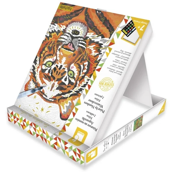 On retrouve dans ce coffret un tigre sur le premier tableau, et des léopards sur le second. Il contient également un cadre que l’on peut peindre pour le personnaliser et l’assortir à ses tableaux . Une palette de 15 peintures aquarelles, une éponge et un pinceau à réservoir d’eau font de ce coffret une activité originale et complète. Un livret explicatif indique la correspondance couleur de chacun des numéros. L’un des deux tableaux a des effets de dorures pour un résultat encore plus spectaculaire. Le packaging se transforme en chevalet pour faciliter l’activité.