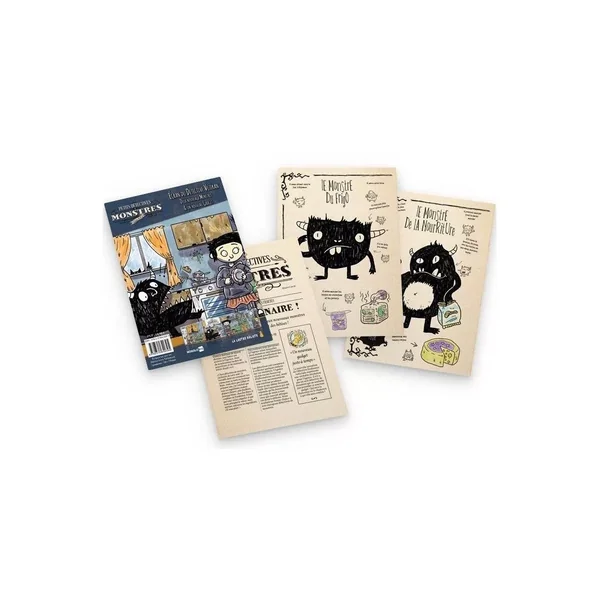 L’écran est accompagné de feuillets présentant, sous forme d’article de journal, 2 Monstres et 1 Super Gadget exclusifs.