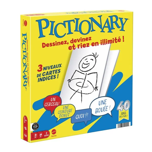 Dessinez, devinez, et gagnez ! Pictionary comprend désormais 2 feutres effaçables, un tableau et de nouvelles cartes mises à jour. Information : Attention, présence de petits éléments, risque d’étouffement. Ne convient pas aux enfants de moins de 36 mois. FAQ