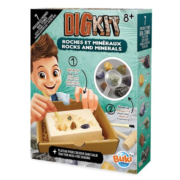 Avec les outils, déterre et observe 7 véritables pierres dont du quartz blanc, une obsidienne, une turquoise et une agate.