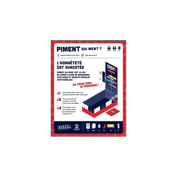 Piment qui Ment ? est un jeu de société d’ambiance jouable de 3 à 20 joueurs, dès 14 ans pour des parties d’environ 15 minutes, édité par Fiesta Games.