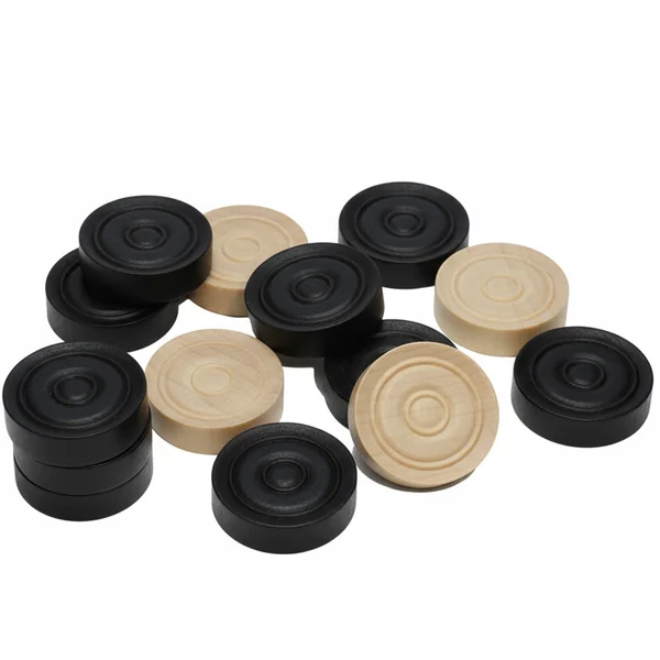 Pions de dames en bois noir/clair dans une boîte en bois brut.