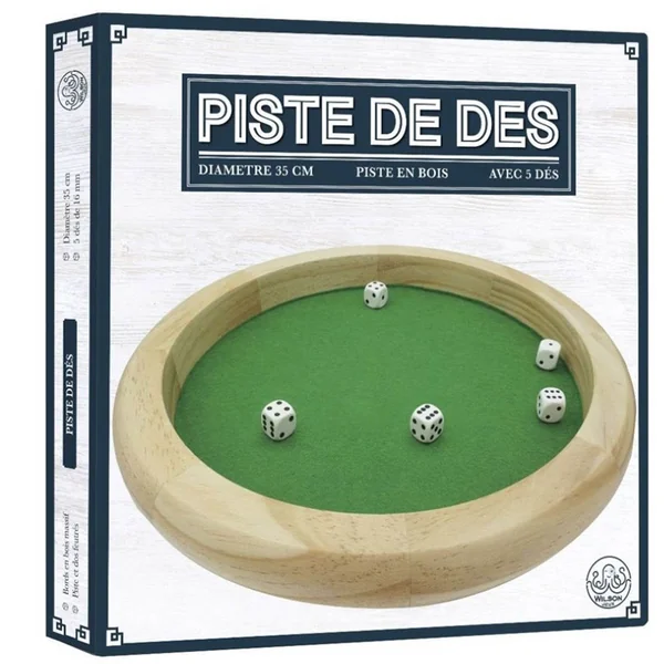 Piste de dés en bois massif 35 cm, bord en bois massif. Piste dessus et dessous feutrée. Fournie avec 5 dés 16mm. Information : Attention, présence de petits éléments, risque d’étouffement. Ne convient pas aux enfants de moins de 36 mois. FAQ