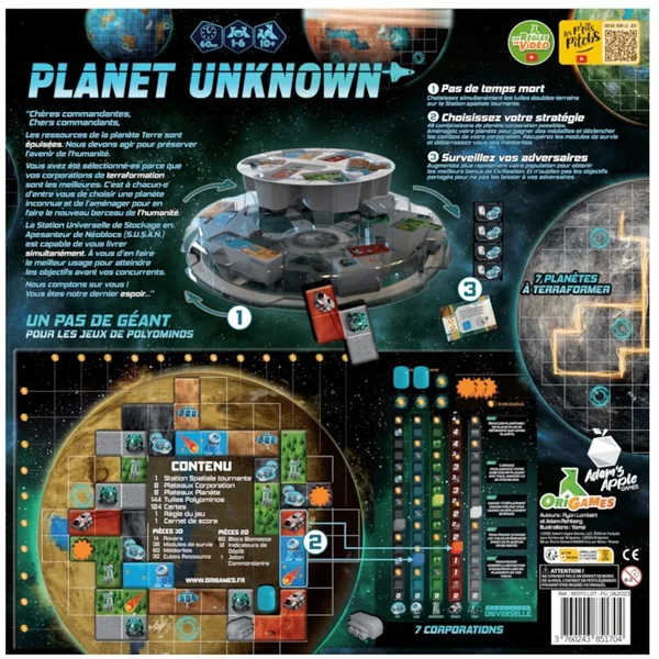 Développez une planète inconnue à l’aide de polyominos. A chaque tour, placez une tuile de développement sur votre planète. Les tuiles comportent deux des six terrains qui représentent l’infrastructure nécessaire pour soutenir la vie sur la planète. Augmentez vos pistes de ressources pour compléter un maximum de lignes et de colonnes sur votre planète pour marquer des points de victoire.