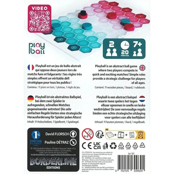 Découvrez Playball, un jeu abstrait pour deux joueurs dans lequel vous contrôlez une équipe de trois playballers sur un terrain composé d’hexagones. Déplacez, sautez et passez la balle pour tenter de marquer des buts dans l’en-but adverse. Accessible dès les premières parties tout en offrant une belle profondeur tactique, Playball vous proposera des parties rapides vous invitant à chaque tour de jeux à développer votre sens du placement et de l’anticipation.