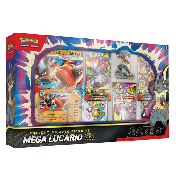 Sans pitié, Méga-Lucario-ex frappe les adversaires tout en partageant les Énergies défaussées avec vos Pokémon de Banc ! Ajoutez cette puissance incroyable à votre collection avec une carte promo brillante pour le jeu, accompagnée d’une carte promo grand format et d’une figurine détaillée de Méga-Lucario en pleine action. Vous trouverez également d’autres superbes Pokémon dans les boosters inclus.