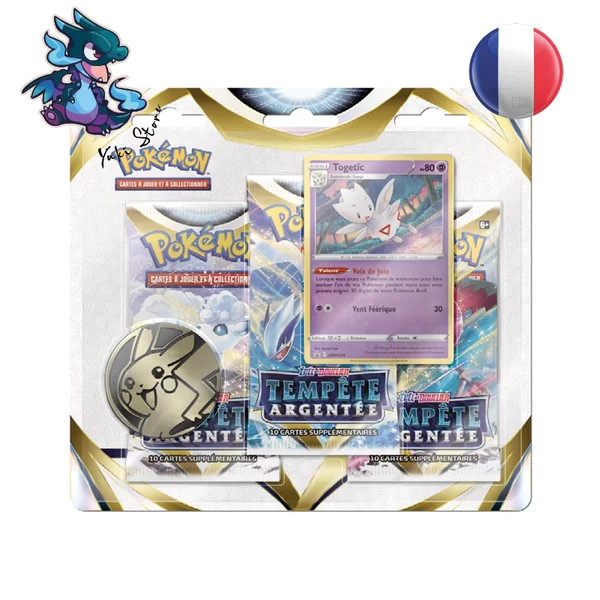 Pack de 3 Boosters Pokémon en Français de l’extension Tempête Argentée (EB12 – Épée & Bouclier), contenant également une carte promo et une pièce.