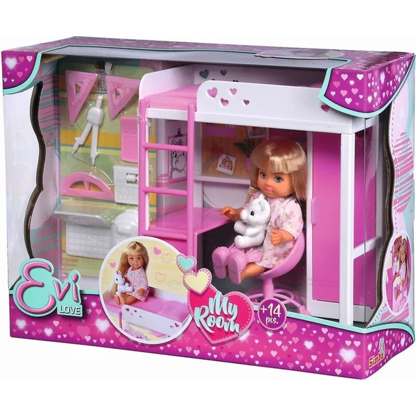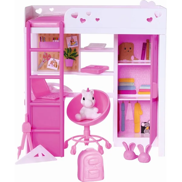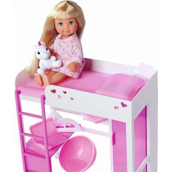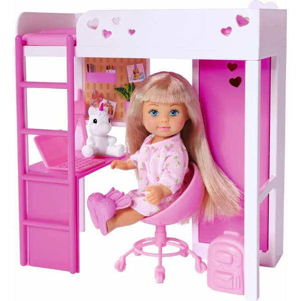 Poupée Evička avec un lit surélevé, un bureau, une armoire et d’autres accessoires.