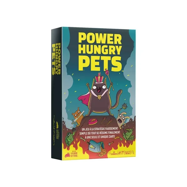 Power Hungry Pets est un jeu d’ambiance qui revisite Love Letter, pour 2 à 6 joueurs dès 7 ans, pour des parties de 15 minutes, édité par Exploding Kittens.
