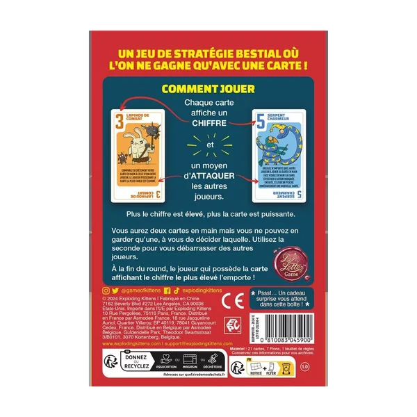 Choisissez celle que vous gardez et jouez l’autre en appliquant son effet. À la fin de la manche, le joueur qui a la carte de plus grande valeur l’emporte. Un jeu malin et retors.