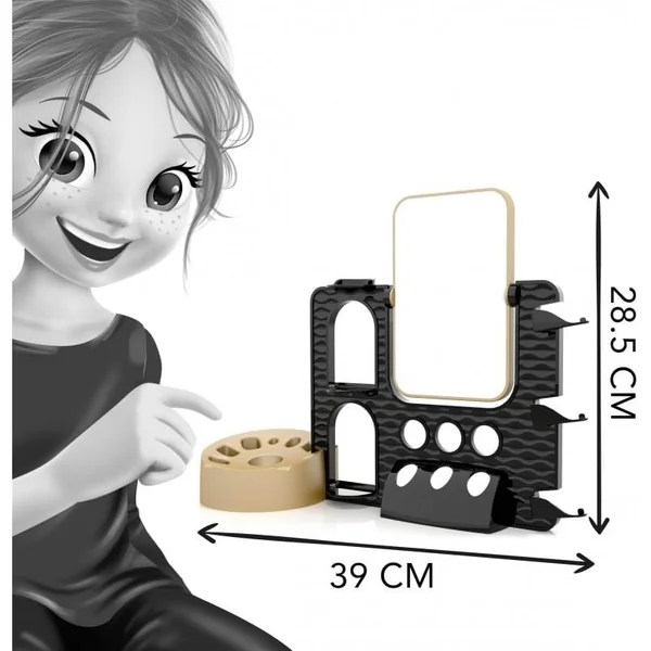 1 miroir et des nombreux rangements pour installer tout le matériel: lime à ongles, 2 pinceaux, 1 outil de manucure pour faire des pois et un bâtonnet cuticule.