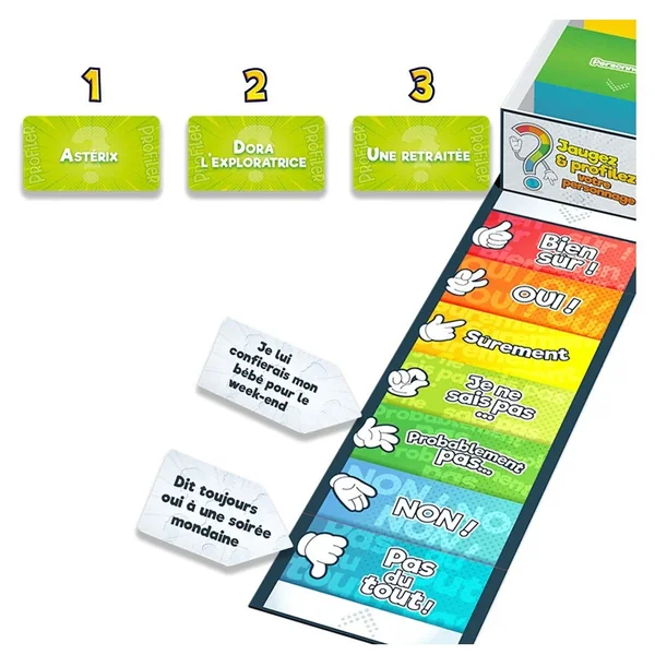Le Profiler, quant à lui, doit faire deviner son personnage en plaçant 2 cartes le long d’une jauge. Par exemple, il évaluera la carte « manque de maturité » pour Chuck Norris sur une échelle de « Absolument pas ! » à « Évidemment ! » !