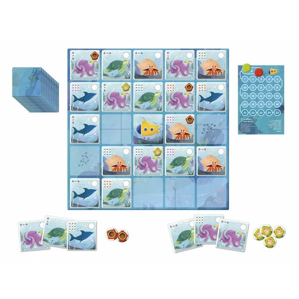 Un groupe de jeunes plongeurs s’aventurent sous l’eau pour observer les animaux. Place au mieux les cartes Océan et tes jetons plongeurs pour réussir la plus belle plongée !