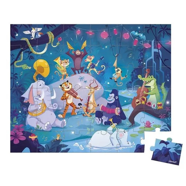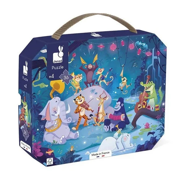 Embarquez votre enfant pour un concert en plein air au fin fond de la jungle ! Un voyage musical et enchanté avec ce magnifique puzzle en carton de 36 pièces aux nombreux détails et aux couleurs festives. Votre enfant développera mémoire et dextérité, avec ce beau puzzle en carton de 36 pièces. Dans sa jolie valisette, ce puzzle sera facile à transporter grâce à sa poignée en tissu. Contient un poster servant de modèle pour les débutants, les plus aguerris pourront ensuite réaliser le puzzle en toute autonomie. Fabriqué en France, produit à base d’encres végétales. Puzzle pour les enfants à partir de 4 ans.
