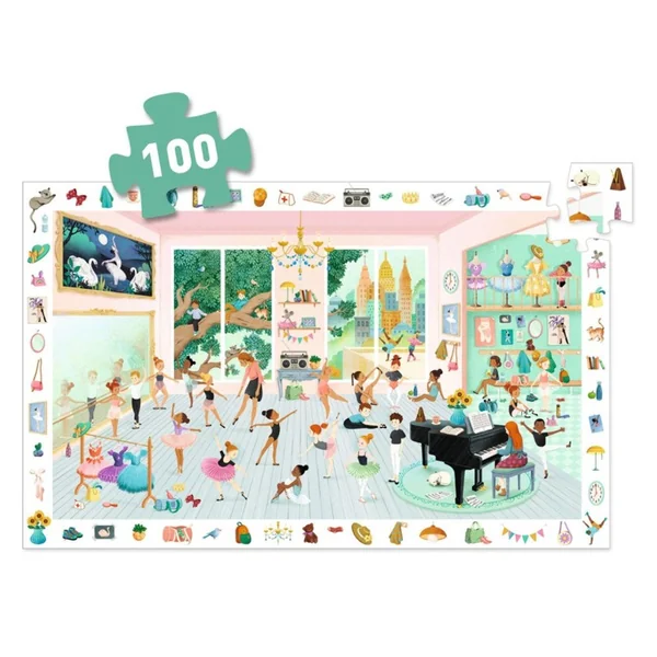 Un puzzle observation de 100 pièces pour découvrir l’école de danse où les jeunes danseurs s’entraînent pour devenir les futures étoiles de l’opéra. L’enfant crée son puzzle puis s’amuse à retrouver dans l’image les éléments de la frise.